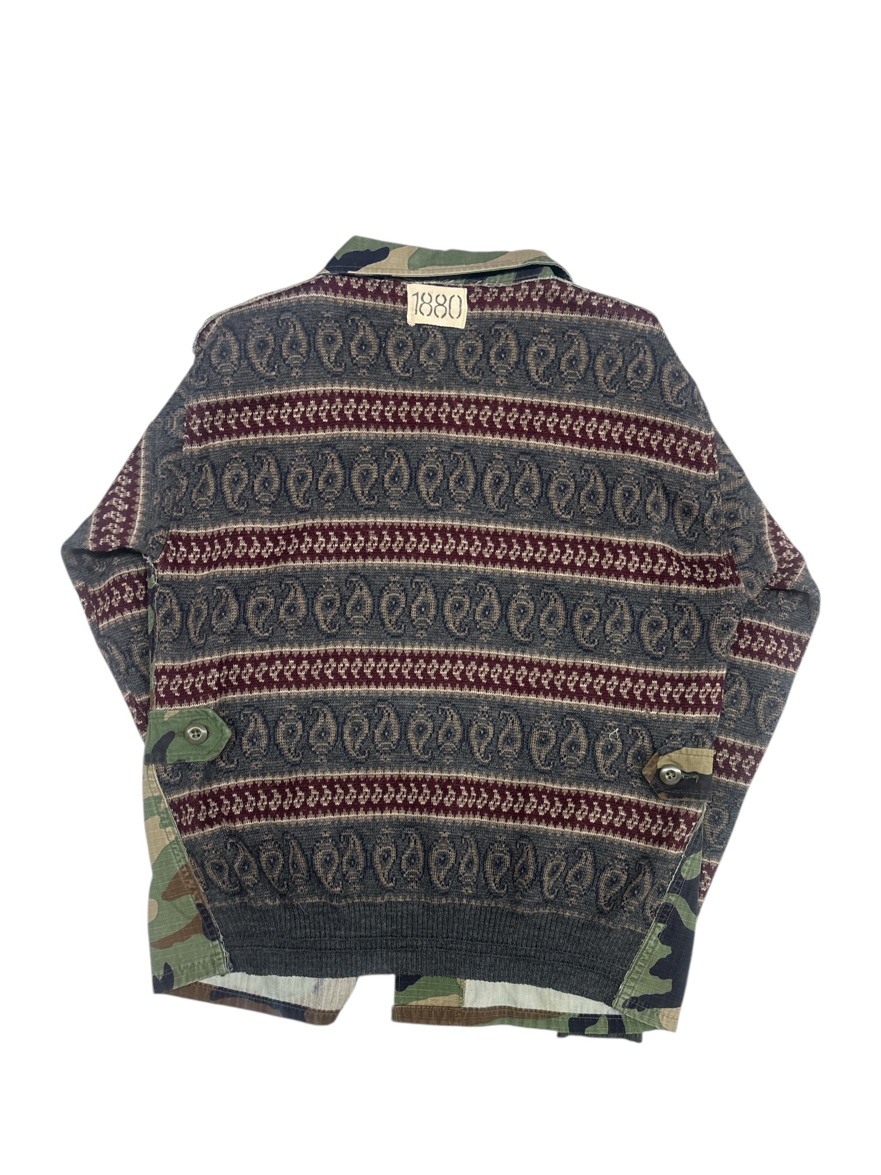 Vintage camouflage military jacket reconstructed with vintage sweater sleeves and back.