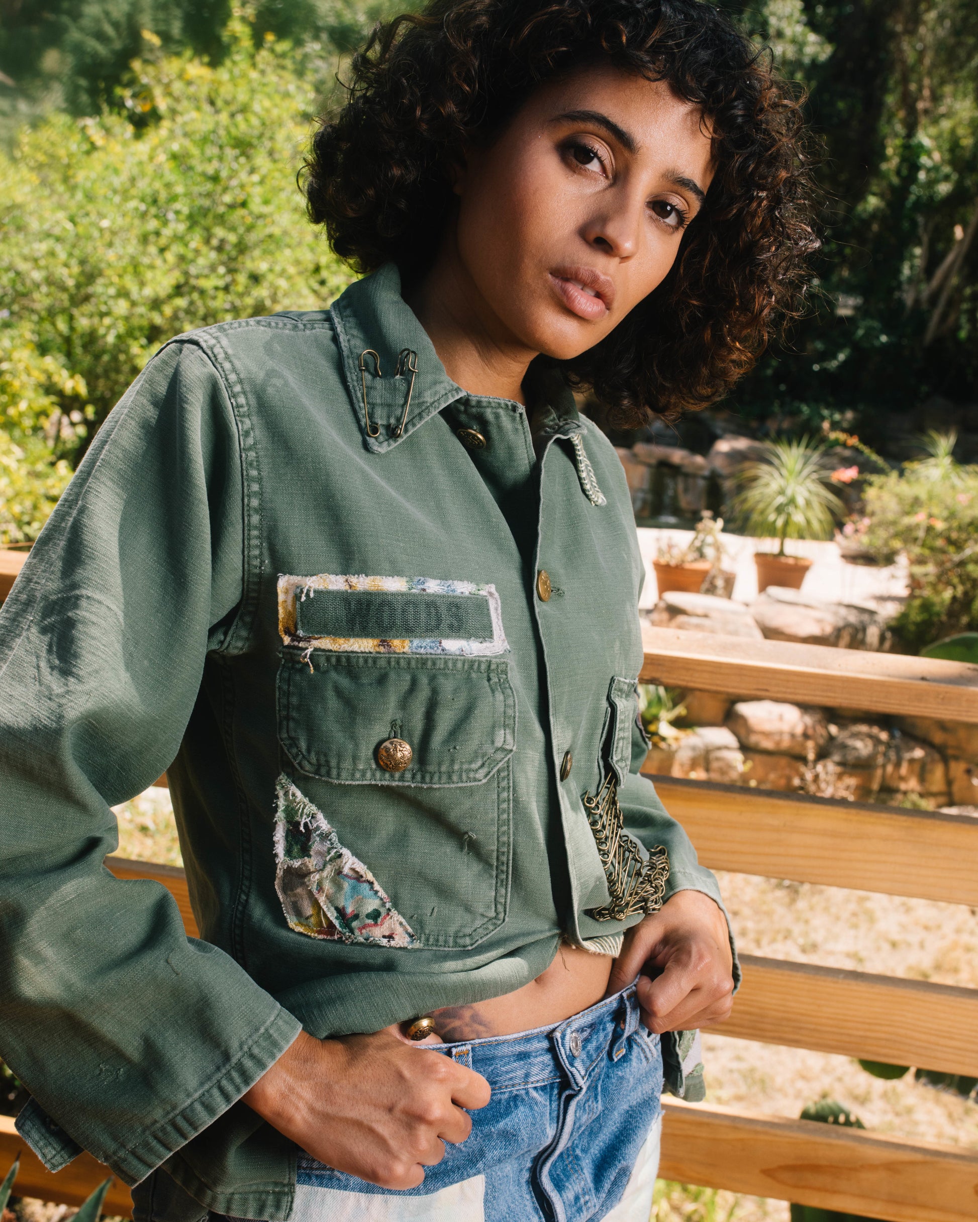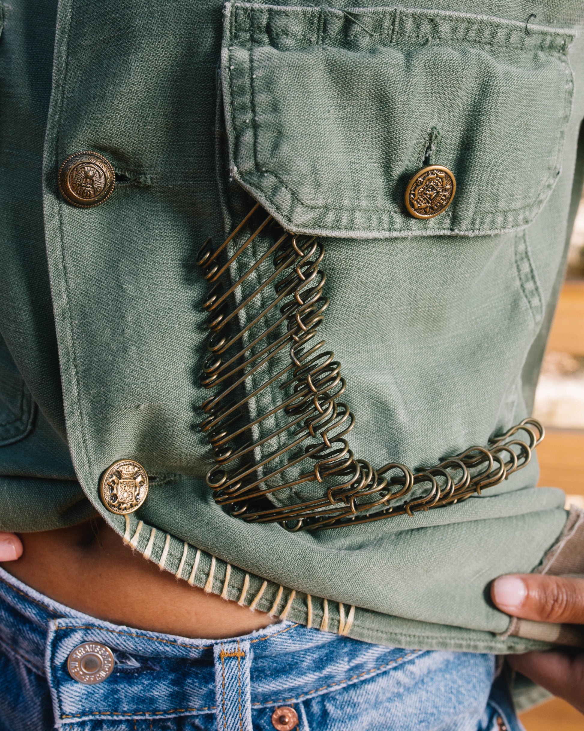 Adorned with an assortment of vintage military pins and buttons. Finished off with vintage fabrics from our archives and hand-stitching.