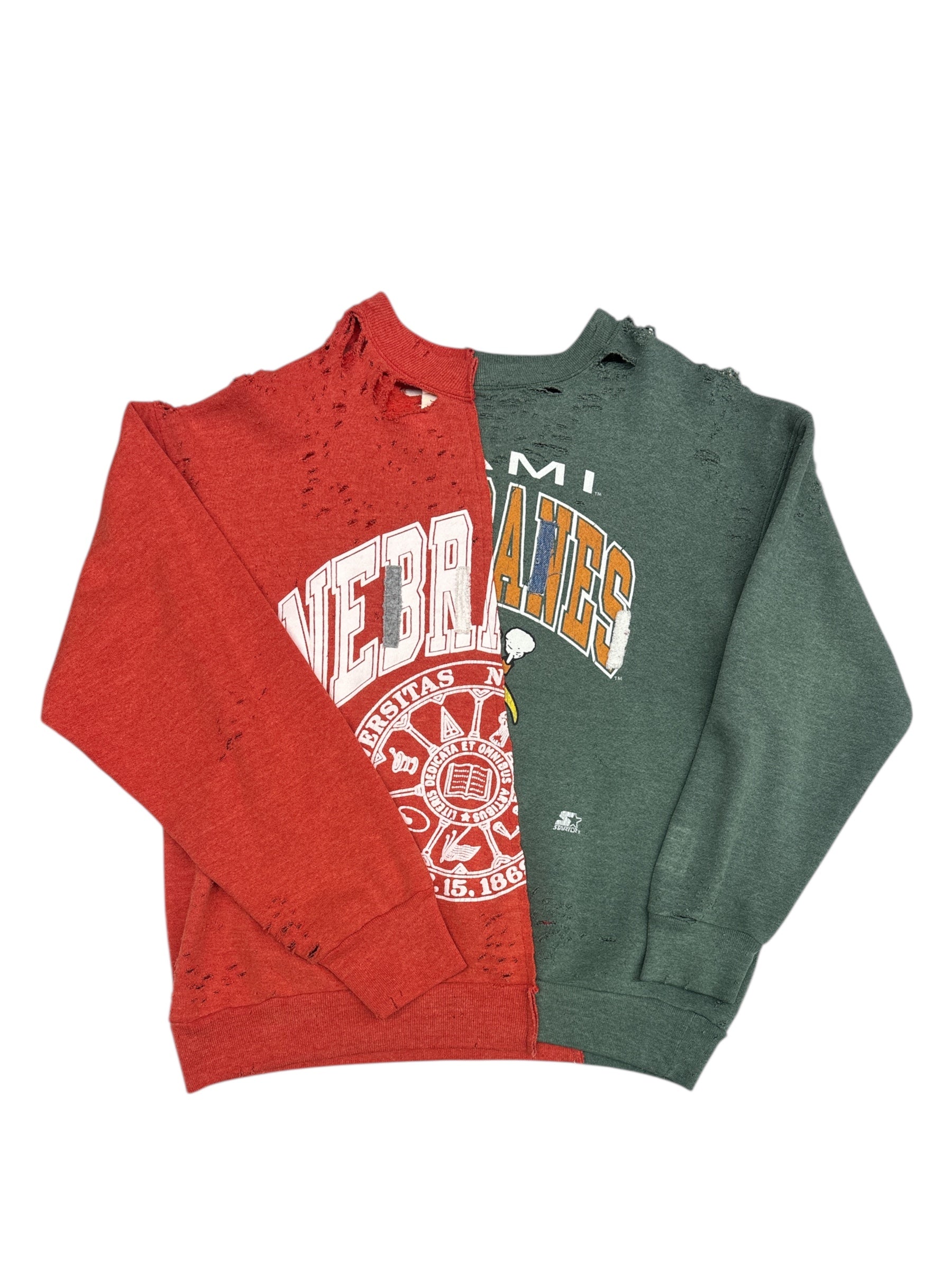 1/1 split vintage sweatshirts, distressed and adorned with pieces from our vintage archives.